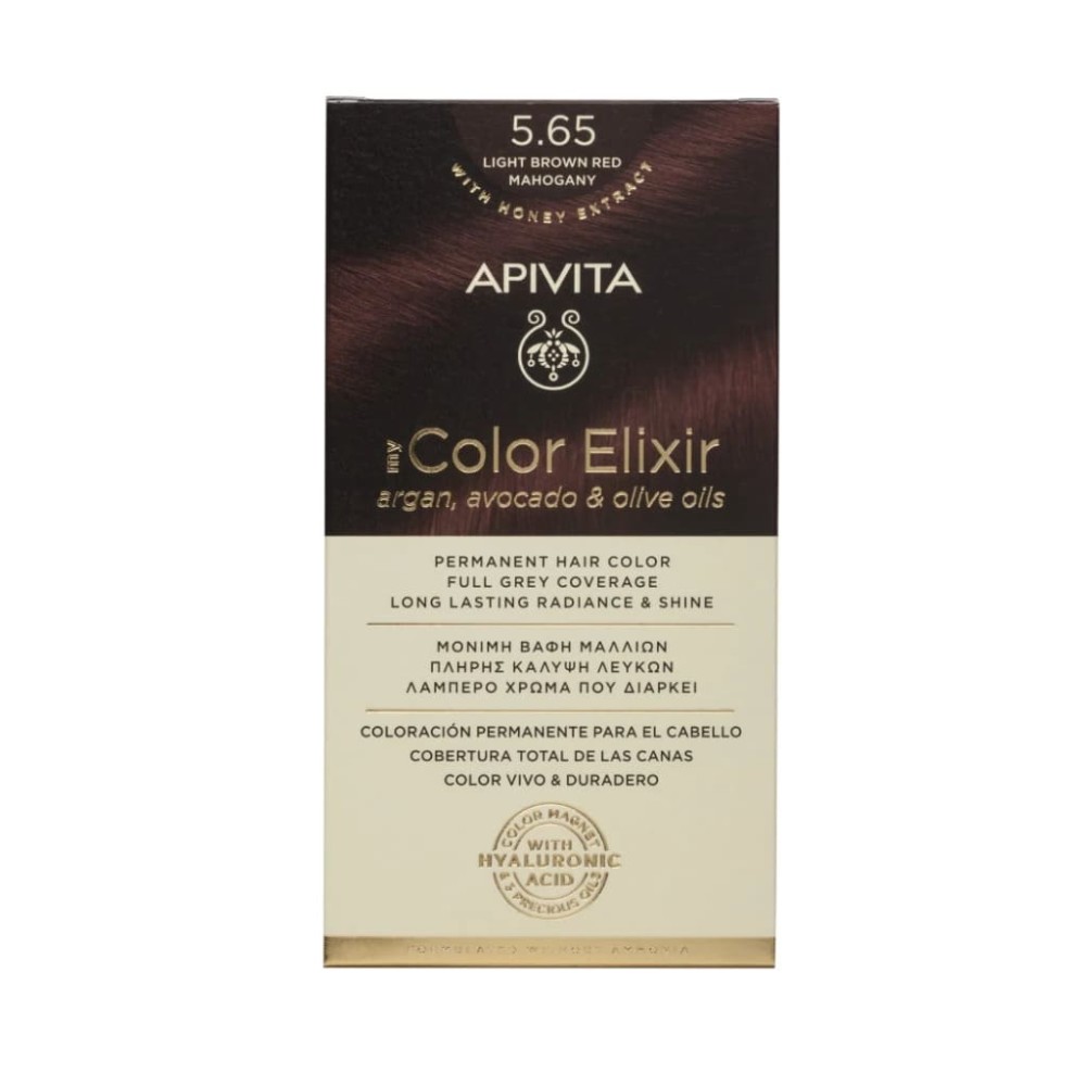Η μόνιμη βαφή μαλλιών My Color Elixir της APIVITA είναι ειδικά σχεδιασμένη με γνώμονα τη φυσικότητα, το επαγγελματικό αποτέλεσμα και με απόλυτο σεβασμό στο τριχωτό. Ένα καινοτόμο σύστημα που σταθεροποιεί και σφραγίζει το χρώμα στην τρίχα. ΑΠΟΤΕΛΕΣΜΑ, Η ΤΡΙΧΑ ΚΡΑΤΑ ΣΑ ΜΑΓΝΗΤΗΣ ΤΟ ΧΡΩΜΑ Πώς λειτουργεί: Εξασφαλίστε τη μέγιστη ένταση και διάρκεια στο χρώμα των μαλλιών σας σε 2 βήματα: Βήμα 1ο: Αποκτήστε τέλεια κάλυψη των λευκών και λάμψη σε μόλις 30 λεπτά χάρη στην κρέμα βαφής με 3 πολύτιμα έλαια (argan, αβοκάντο, και ελιάς ) που δρουν συνδυαστικά για να σταθεροποιήσουν το χρώμα και να επανορθώσουν τη δομή της τρίχας κατά τη διάρκεια της διαδικασίας βαφής των μαλλιών. Βήμα 2ο: Ενισχύστε την ένταση και τη λάμψη εφαρμόζοντας την κρέμα περιποίησης για μετά τη βαφή με υαλουρονικό οξύ και εκχύλισμα μελιού που ενυδατώνει τα μαλλιά, δημιουργώντας ένα φιλμ προστασίας που σφραγίζει το χρώμα στην τρίχα και αναδεικνύει τη λάμψη των βαμμένων μαλλιών. Εφαρμόστε ξανά μετά από 15 μέρες. Η βαφή My Color Elixir δεν περιέχει τις κυριότερες "ανεπιθύμητες" ουσίες: PPD (para-phenylenediamine): βασική χρωμοφόρα ομάδα σε προϊόντα βαφής που αποτελεί και την κυριότερη αλλεργιογόνο ουσία σε βαφές μαλλιών. Αμμωνία: αλκαλικό μέσο που χρησιμοποιείται για να ανοίξουν τα λέπια του περιτριχίου και να εισχωρήσει η βαφή και έχει δυσάρεστη και βαριά μυρωδιά. Οινόπνευμα: μπορεί να ερεθίσει το τριχωτό της κεφαλής και να αφυδατώσει την τρίχα Resorcinol, Parabens, Propylene Glycol, SLS, Mineral oil, Silicones, 26 ταυτοποιημένα αλλεργιογόνα των αρωμάτων: ουσίες που συχνά ενοχοποιούνται για αλλεργίες, ερεθισμούς και άλλες ανεπιθύμητες δράσεις. Η Συσκευασία περιλάμβάνει Κρέμα βαφή σε σωληνάριο, 50ml Γαλάκτωμα ενεργοποίησης χρώματος σε φιαλίδιο με απλικατέρ Vol 20, 75ml Κρέμα μαλλιών για μετά τη βαφή σε 2 φακελάκια, 15ml Ένα ζευγάρι γάντια Οδηγίες χρήσης