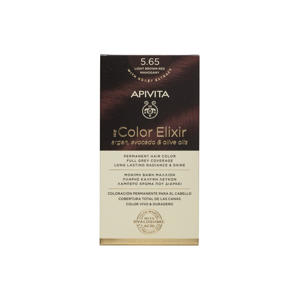 Permanent Hair Color Cream 5.65 INCI UE-(USA): aqua (water), laureth-3, cetearyl alcohol, laureth-4, polysorbate 80, ethanolamine, aminomethyl propanol, glycol distearate, sorbitan stearate, sodium C14-16 olefin sulfonate, cocamidopropyl betaine, glycerin, glyceryl stearate se, cocos nucifera oil (cocos nucifera (coconut) oil), glyceryl isostearate, 4-amino-2-hydroxytoluene, sorbitan oleate, oleic acid, stearic acid, toluene-2,5-diamine sulfate, betaine, peg-40 hydrogenated castor oil, polyquaternium-22, hydrogenated castor oil, ceteareth-20, palmitic acid, sodium sulfite, sodium hydrosulfite, cera alba (beeswax), lecithin, tetrasodium edta, ceteareth-33, erythorbic acid, linum usitatissimum extract (linum usitatissimum (linseed) seed extract), argania spinosa kernel oil*, etidronic acid, olea europaea fruit oil (olea europaea (olive) fruit oil)*, persea gratissima oil (persea gratissima (avocado) oil)*, helianthus annuus seed oil (helianthus annuus (sunflower) seed oil)*, mel extract (honey extract)*, rosmarinus officinalis extract (rosmarinus officinalis (rosemary) leaf extract)*, potassium sorbate, sodium benzoate, benzyl alcohol, parfum (fragrance), phenyl methyl pyrazolone, p-methylaminophenol sulfate, p-aminophenol, 2,4-diaminophenoxyethanol sulfate. *from organic farming / από βιολογικές καλλιέργειες / de cultivos orgánicosColor Developer 20 vol. INCI UE-(USA): aqua (water), hydrogen peroxide, cetearyl alcohol, ceteareth-20, cetyl alcohol, etidronic acid, oxyquinoline sulfate.Post Color Hair Conditioner INCI UE-(USA): aqua (water), cetearyl alcohol, cetyl esters, distearoylethyl dimonium chloride, dicaprylyl ether, glycerin, coco-caprylate, capryloyl/caproyl methyl glucamide, cocos nucifera oil (cocos nucifera (coconut) oil), trehalose, tocopherol, guar hydroxypropyltrimonium chloride, olea europaea fruit oil (olea europaea (olive) fruit oil)*, mel extract (honey extract)*, helianthus annuus seed oil (helianthus annuus (sunflower) seed oil)*, sodium hyaluronate, sodium pca, decyl glucoside, lactic acid, glyceryl oleate, rosmarinus officinalis extract (rosmarinus officinalis (rosemary) leaf extract)*, lavandula angustifolia oil (lavandula angustifolia (lavender) oil), benzoic acid, citric acid, sorbic acid, potassium sorbate, benzyl alcohol, parfum (fragrance).