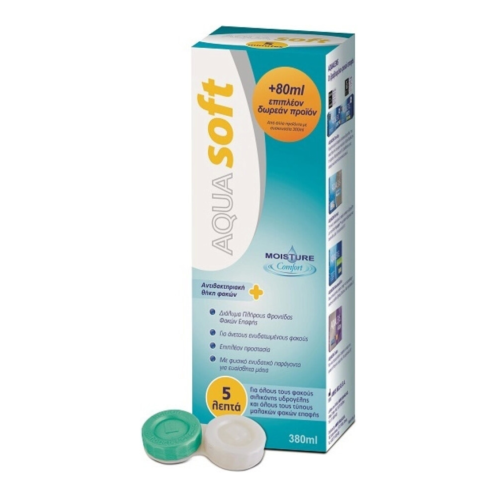 Πλήρες διάλυμα φροντίδας φακών επαφής, που καθαρίζει, ξεπλένει, απολυμαίνει, συντηρεί,αφαιρεί τις πρωτεΐνες και λιπαίνει τους φακούς επαφής. Κατάλληλο για όλους τους φακούς σιλικόνης υδρογέλης και όλους τους τύπους μαλακών φακών επαφής.Φακοί έτοιμοι να φορεθούν, σε 5 λεπτά! Σύσταση: Το AQUAsoft της AMVIS είναι ένα ισότονο, υδατώδες αντιμικροβιακό/αντιβακτηριδιακό διάλυμα, που περιέχειpolyhexanide 0.00013% w/v (δραστική ουσία και συντηρητικό) και υαλουρονικό νάτριο (HA). Προσφέρει υψηλό βαθµό ενυδάτωσης, «αντιγράφει» το µηχανισµό ενυδάτωσης των φυσικών δακρύων, απλώνεται κάθε φορά που ανοιγοκλείνουν τα βλέφαρα, είναι υποαλλεργικό και δεν προκαλεί ερεθισµούς. Καθαρίζει, απολυµαίνει, λιπαίνει και αποµακρύνει τις εναποθέσεις. Κάθε συσκευασία περιέχειτην αντιβακτηριακή θήκη i-clean που εξουδετερώνει τα βακτήρια και αναστέλλειτην ανάπτυξη νέων µικροοργανισµών διατηρώντας τους φακούς σας ασφαλείς.