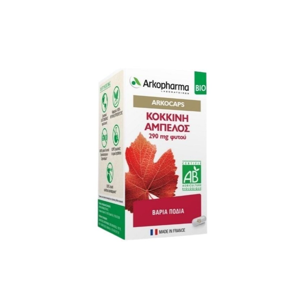 Το Arkopharma Arkocaps Κόκκινη Άμπελος είναι ένα συμπλήρωμα διατροφής με σκόνη φύλλων Vitis vinifera βιολογικής προέλευσης, ιδανικό για την υποστήριξη της κυκλοφορίας και για άτομα με ''βαριά'' και ''κουρασμένα'' πόδια, κιρσούς και αιμορροΐδες.