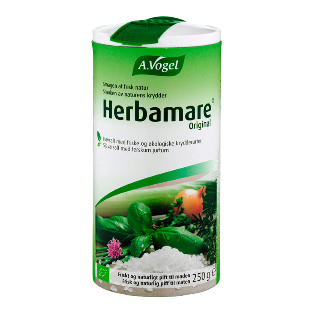 Θαλασσινό αλάτι με λαχανικά, βότανα και φύκη του ωκεανούΤο Herbamare συμπληρώνει τη διατροφή με ιώδιο και μεταλλικά άλατα όπως μαγνήσιο, ασβέστιο, κάλιο, κ.α. Αντικαθιστά το κοινό αλάτι, νοστιμεύει και αρωματίζει σαλάτες και φαγητά.Τα λαχανικά και τα μυρωδικά βότανα που προορίζονται για το Herbamare ® είναι βιολογικής καλλιέργειας και καταφθάνουν προς επεξεργασία μέσα σε λίγες ώρες από τη συγκομιδή.Κατά την άφιξή τους, καθαρίζονται χειρονακτικά, ψιλοκόβονται προσεκτικά και αναμιγνύονται με φυσικό θαλασσινό αλάτι. Στη συνέχεια ωριμάζει για ένα έτος για να απομακρυνθεί και το υπόλοιπο της υγρασίας μέσω ειδικής διαδικασίας σε κενό αέρος και σε χαμηλή θερμοκρασία.Αυτή η διαδικασία ωρίμανσης επιτρέπει τις γεύσεις και τα αρώματα των βοτάνων και των λαχανικά να ενσωματωθούν πλήρως στην κρυσταλλική δομή του άλατος.