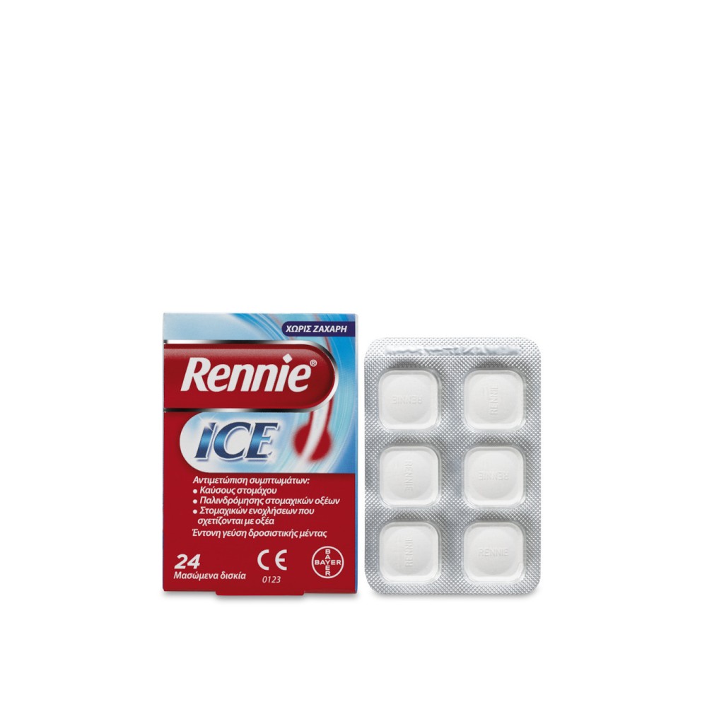 Bayer Rennie Ice Αντιμετώπιση Συμπτωμάτων Καύσους Στομάχου/Γαστρικών Ενοχλήσεων - 24 Μασώμενα Δισκία Χωρίς Ζάχαρη