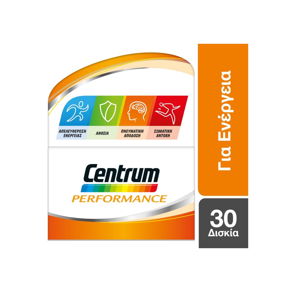 Ο σύγχρονος τρόπος ζωής απαιτεί όλο και περισσότερο μέγιστες αποδόσεις. Το Centrum Performance περιέχει βιταμίνες, μέταλλα, Ginseng και Gingko Biloba για να προσφέρει ενέργεια και ενίσχυση της σωματικής και πνευματικής απόδοσης. Ο συνδυασμός του Ginseng, του Gingko Biloba και των βιταμινών μπορούν να χρησιμοποιηθούν ως πηγή επιπλέον ενέργειας για τη μείωση της κούρασης και την υποστήριξη της φυσικής κατάστασης σε περιόδους ανάρρωσης ή στρες. Εύκολο στη λήψη, όπου και όποτε το χρειαστείτε. Κατάλληλο για ενήλικες και παιδιά 15 ετών και άνω.