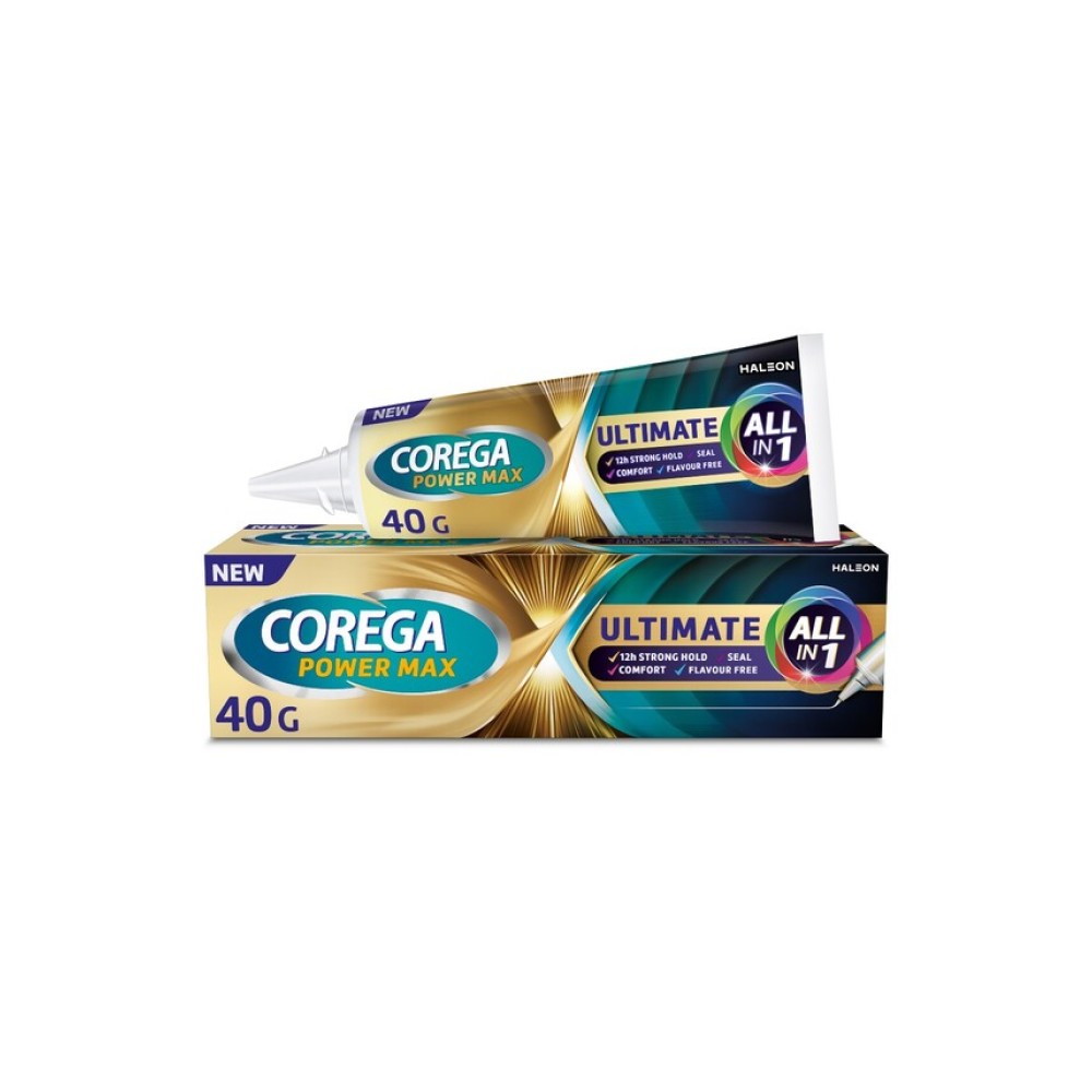 Corega Power Max Ultimate All In One Στερεωτική Κρέμα Τεχνητής Οδοντοστοιχίας Για Ακόμα Μεγαλύτερη Δύναμη Μασήματος 40gr