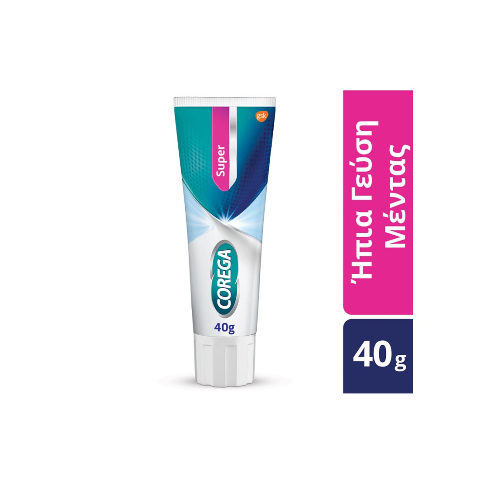 Η στερεωτική κρέμα οδοντοστοιχιών Corega Super σας προσφέρει δυνατή συγκράτηση όλη μέρα και ένα αίσθημα σιγουριάς για να απολαύσετε τις αγαπημένες σας τροφές. Προστατεύει τα ούλα εμποδίζοντας τα ενοχλητικά υπολείμματα φαγητού να εισχωρούν μεταξύ οδοντοστοιχίας και ούλων. Με ουδέτερη γεύση. Δεν επηρεάζει τη γεύση των τροφών. Κατάλληλη για χρήση από άτομα που ακολουθούν ομοιοπαθητική θεραπεία. Νέα Σύνθεση: Χωρίς ψευδάργυρο. Οδηγίες Χρήσης: Εφαρμογή: 1. Καθαρίστε και στεγνώστε την τεχνητή οδοντοστοιχία. 2. Εφαρμόστε τη στερεωτική κρέμα σε Μικρές Λωρίδες, όχι πολύ κοντά στα άκρα της οδοντοστοιχίας. 3. Ξεπλύνετε το στόμα σας πριν τοποθετήσετε την οδοντοστοιχία. 4. Τοποθετείστε την οδοντοστοιχία στη θέση της, κρατείστε σταθερά και δαγκώστε για λίγα δευτερόλεπτα ώστε να εξασφαλίσετε καλή εφαρμογή. Αφαίρεση: 1. Ξεπλύνετε το στόμα με νερό. 2. Μετακινείστε αργά την οδοντοστοιχία με κυκλική κίνηση. 3. Αφαιρέστε τα υπολείμματα της κρέμας από την οδοντοστοιχία και το στόμα με ζεστό νερό και μια μαλακή οδοντόβουρτσα. 4. Χρησιμοποιείστε καθαριστικά δισκία Corega για να καθαρίσετε την οδοντοστοιχία σας. Σημαντικές Πληροφορίες: Για την πρώτη φορά, χρησιμοποιείστε μια μικρή ποσότητα. Χρησιμοποιείστε περισσότερη εάν χρειάζεται. Μεγάλη ποσότητα μπορεί να προκαλέσει υπερχείλιση. Μπορεί να χρειαστούν μερικές προσπάθειες για να βρείτε τη σωστή ποσότητα για την οδοντοστοιχία σας. Εφαρμόστε μια φορά τη μέρα για δυνατή συγκράτηση. Μην εφαρμόζετε περισσότερες από μια φορά την ημέρα. Επισκέπτεστε τον οδοντίατρό σας τακτικά. Η οδοντοστοιχία που δεν εφαρμόζει καλά μπορεί να επηρεάσει την υγεία σας. Για να μη φράξει το στόμιο, διατηρείστε το καπάκι και το ρύγχος στεγνά.