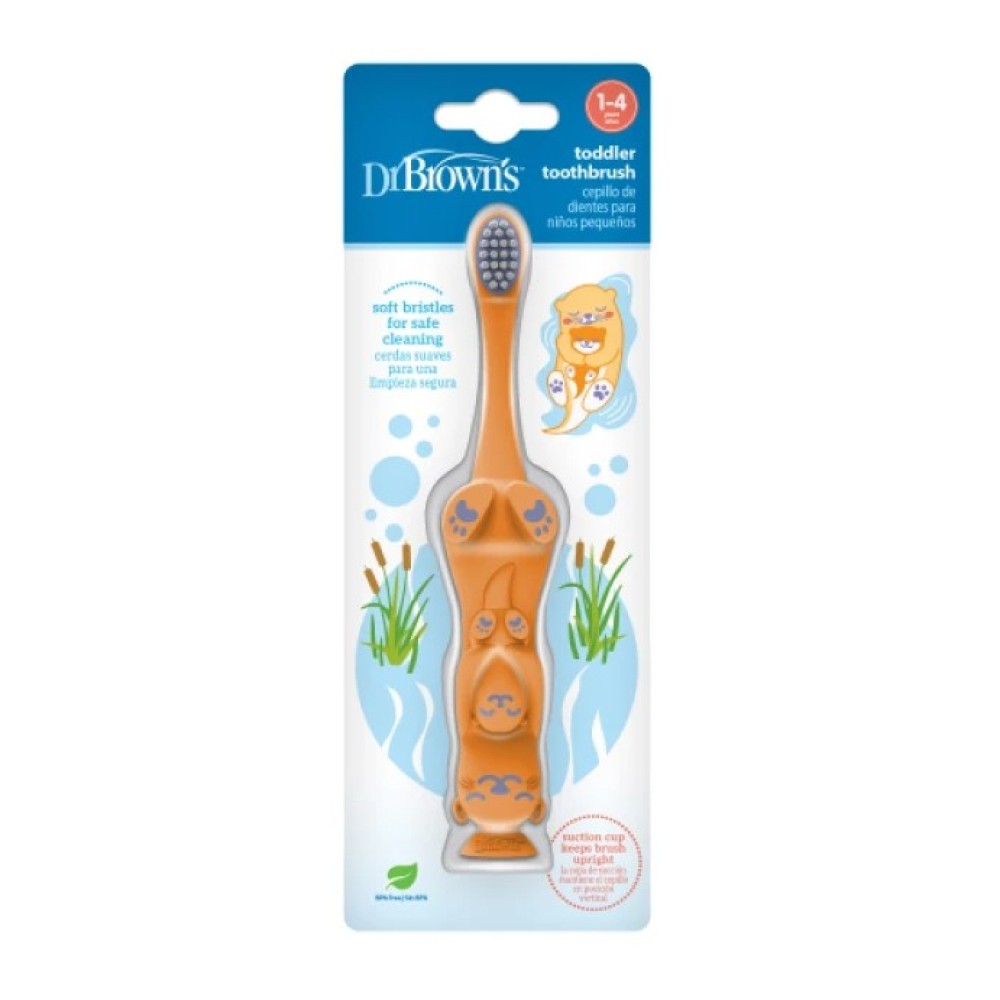 Απαλή και εργονομική οδοντόβουρτσα σε σχέδιο βίδρας, ιδανική για νήπια 0-4 ετών, με μαλακές τρίχες για ευαίσθητα ούλα και βάση με βεντούζα για αποθήκευση.