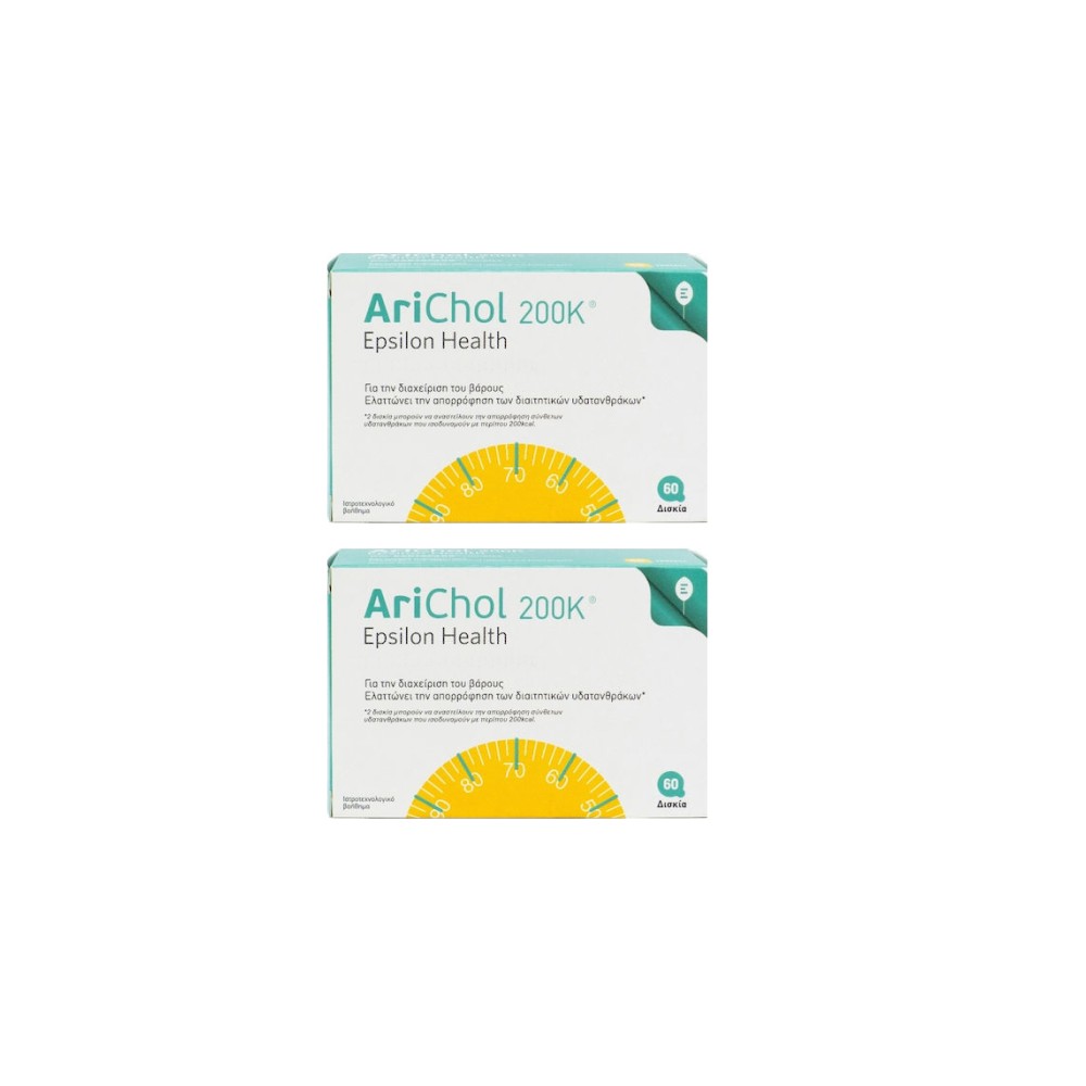 Το Epsilon Health Arichol 200K είναι ένα συμπλήρωμα διατροφής για αδυνάτισμα και για τον έλεγχο του βάρους που περιέχει το γλυκοπρωτεϊνικό σύμπλεγμα Captocarb από φασόλια σε συνδυασμό με σιμενθικόνη.