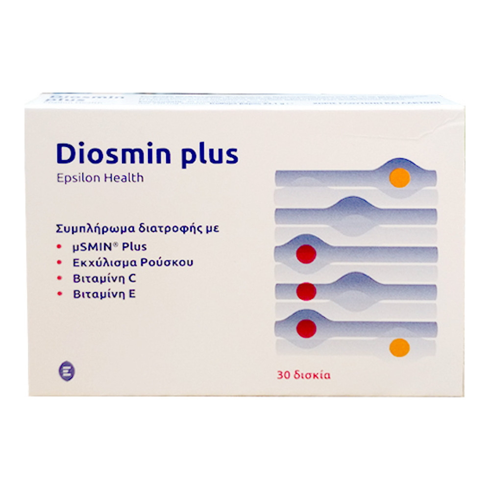 Για τα αγγεία και τις φλέβεςμSMIN διοσμίνη και φλαβονοειδήΕκχύλισμα ρούσκουΒιταμίνες C και ΕΤο Epsilon Health Diosmin Plus είναι ένα συμπλήρωμα διατροφής με το σύμπλοκο διοσμίνης και φλαβονοειδών μSMIN σε συνδυασμό με εκχύλισμα ρούσκου και βιταμίνες C και Ε.