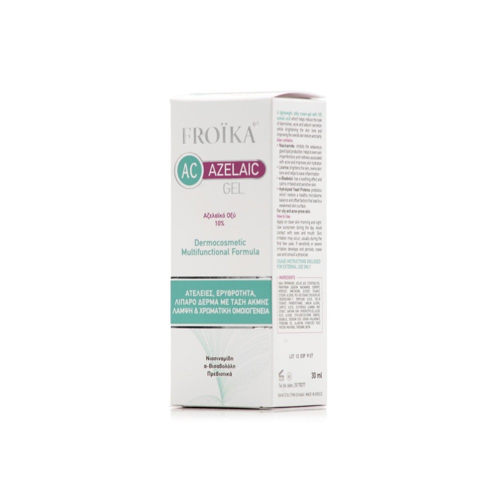 Η Froika AC Azelaic Gel είναι μία ελαφριά κρέμα τζελ με υψηλής καθαρότητας αζελαϊκό οξύ σε περιεκτικότητα 10%, η οποία βοηθά στην μείωση των ατελειών της ακμής και στην ρύθμιση της υπερέκκρισης σμήγματος.