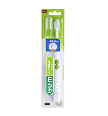 Η Activital Sonic Οδοντόβουρτσα της Gum με μπαταρία δονείται για να καθαρίσει απαλά τα δόντια και να τονώσει τα ούλα, για μια υγιεινή στοματική φροντίδα κάθε μέρα. Οι εξαιρετικά κωνικές τρίχες είναι 50% περισσότερο αποτελεσματικές στην προσέγγιση των μεσοδόντιων διαστημάτων και αφαιρούν 47 φορές περισσότερη πλάκα κάτω από την ουλοδοντική σχισμή. Αντικατάσταση κεφαλής βούρτσας Κρατώντας τη βάση, τραβήξτε προς τα έξω την κεφαλή. Τοποθετήστε τη νέα κεφαλή στη βάση και πιέστε προς τα κάτω. Αντικαταστήστε μόνο με ανταλλακτικό οδοντόβουρτσας Gum Activital Sonic. Αντικατάσταση μπαταρίας Γυρίστε και τραβήξτε προς τα κάτω την λαβή της βάσης. Αντικαταστήστε με μια νέα αλκαλική μπαταρία τύπου ΑΑΑ. Κλείστε το δοχείο και απορρίψτε την μπαταρία. Η συσκευασία περιλαμβάνει: 1 λαβή οδοντόβουρτσας 1 κεφαλή 1 μπαταρία τύπου ΑΑΑ 1 καπάκι οδοντόβουρτσας. Εφαρμόστε μια μικρή ποσότητα οδοντόκρεμας στν κεφαλή της Gum Activital Sonic Οδοντόβουρτσας. Εισάγετε την οδοντόβουρτσα στο στόμα. Ενεργοποιήστε την οδοντόβουρτσα πατώντας το πάνω κεντρικό κουμπί. Χρησιμοποιήστε την ίδια τεχνική βουρτσίσματος, όπως με μια χειροκίνητη οδοντόβουρτσα, χωρίς να εφαρμόζετε καμιά επιπλέον δύναμη. Να μην χρησιμοποιείται από παιδιά κάτω των 3 ετών. Σε παιδιά από 3 ετών και άνω να χρησιμοποιείται μόνο υπό την επίβλεψη ενήλικα. Συνίσταται να αλλάζετε την κεφαλή της βούρτσας κάθε 3 μήνες.