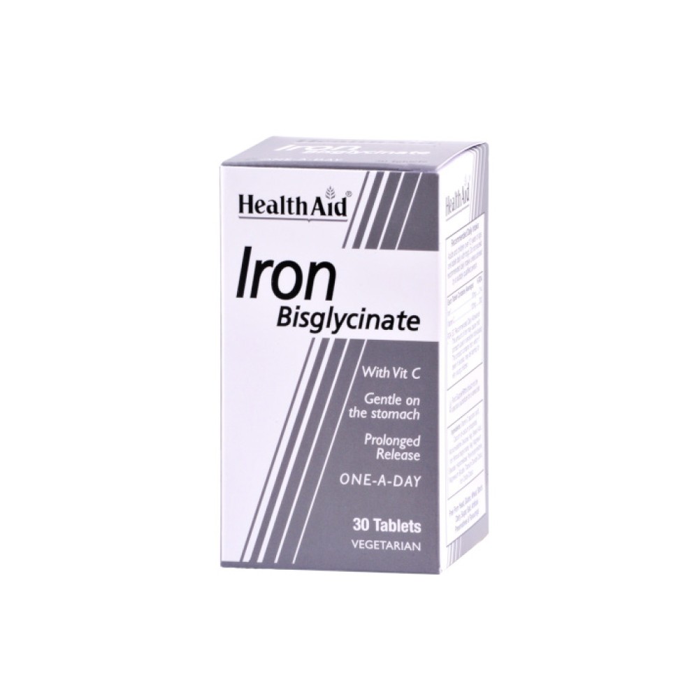 To Health Aid Iron Bisglycinate είναι ένα συμπλήρωμα διατροφής με δυσγλικινικό σίδηρο και βιταμίνη C. Ο σίδηρος είναι σε χηλική μορφή ώστε να επιτυγχάνεται υψηλή βιοδιαθεσιμότητα και απορρόφηση, ενώ δεν προκαλεί γαστρεντερικές διαταραχές.