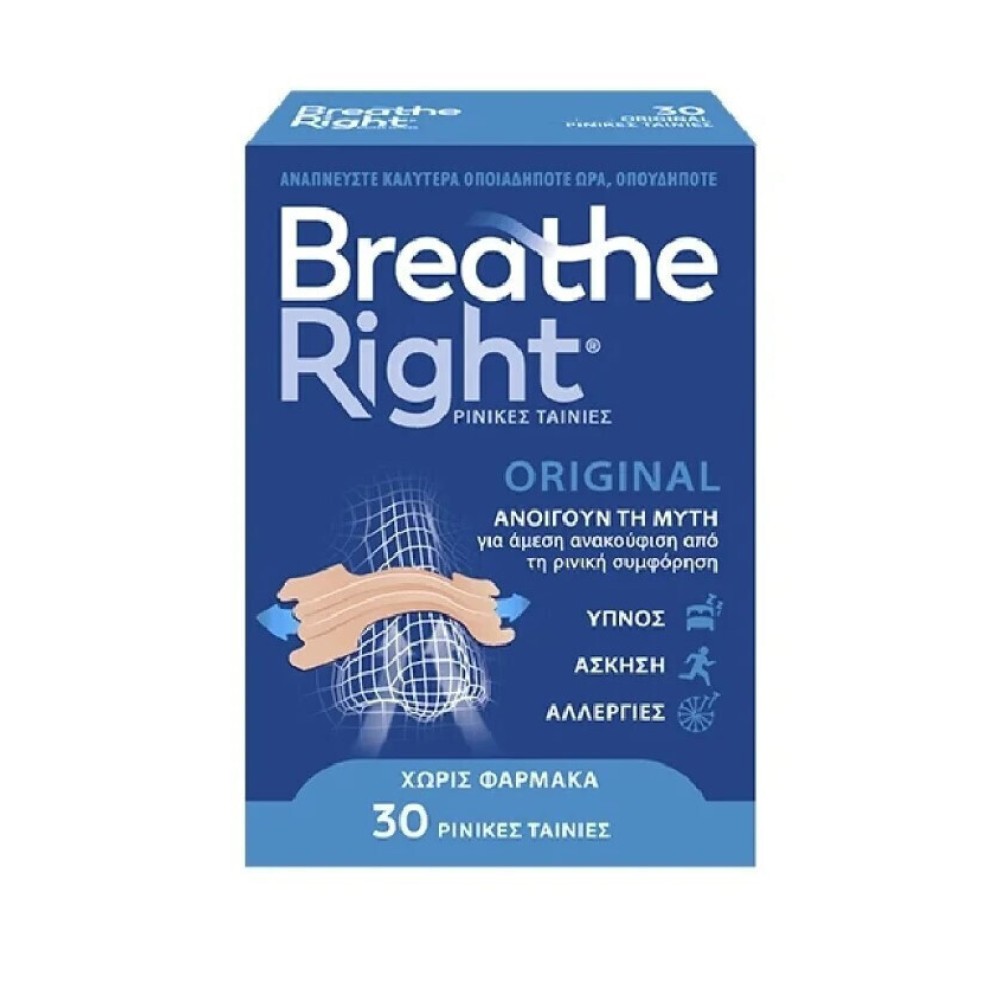 Οι ρινικές ταινίες Breathe Right ελευθερώνουν την αναπνευστική οδό για καλύτερη αναπνοή και προσφέρουν ανακούφιση από τη ρινκή συμφόρηση και μείωση του ροχαλητού. Οι ρινικές ταινίες Breath Right, χωρίς φάρμακα, ανοίγουν τη μύτη σας για να αναπνέετε καλύτερα και παρέχουν προσωρινή ανακούφιση από τη ρινική συμφόρηση που προκαλείται από το κρύωμα ή τις αλλεργίες.