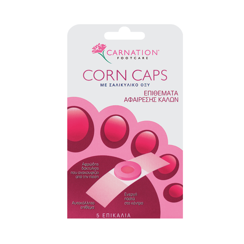 Τα Carnation Cοrn Caps είναι ένα ιατροτεχνολογικό προϊόν και αποτελεί το ιδανικό προϊόν για την αφαίρεση των κάλων. Περιέχει μια μοναδική κρέμα σαλικυλικού οξέος, η οποία εισχωρεί στους σκληρούς κάλους και βοηθά στην αφαίρεση τους ενώ ταυτόχρονα το αφρώδες δαχτυλίδι ανακουφίζει από την πίεση του υποδήματος. Περιέχει αυτοκόλλητες ταινίες, που στερεώνουν το επικάλιο επάνω στο σημείο του κάλου ευνοώντας την καλύτερη θεραπεία του.