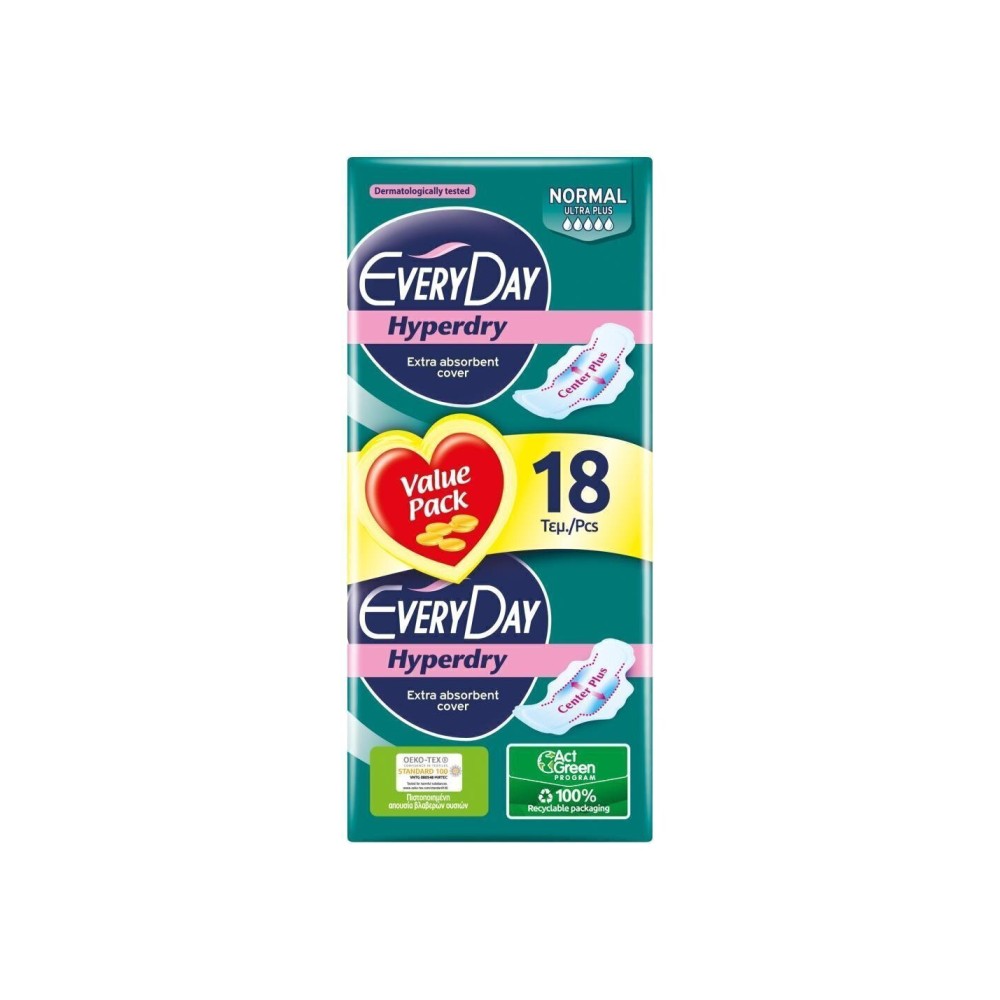 Every Day Hyperdry Normal Ultra Plus Value Pack Πολύ Λεπτές Σερβιέτες Έξτρα Απορροφητικές, Ιδανικές για Κανονική Ροή 18 Τεμάχια