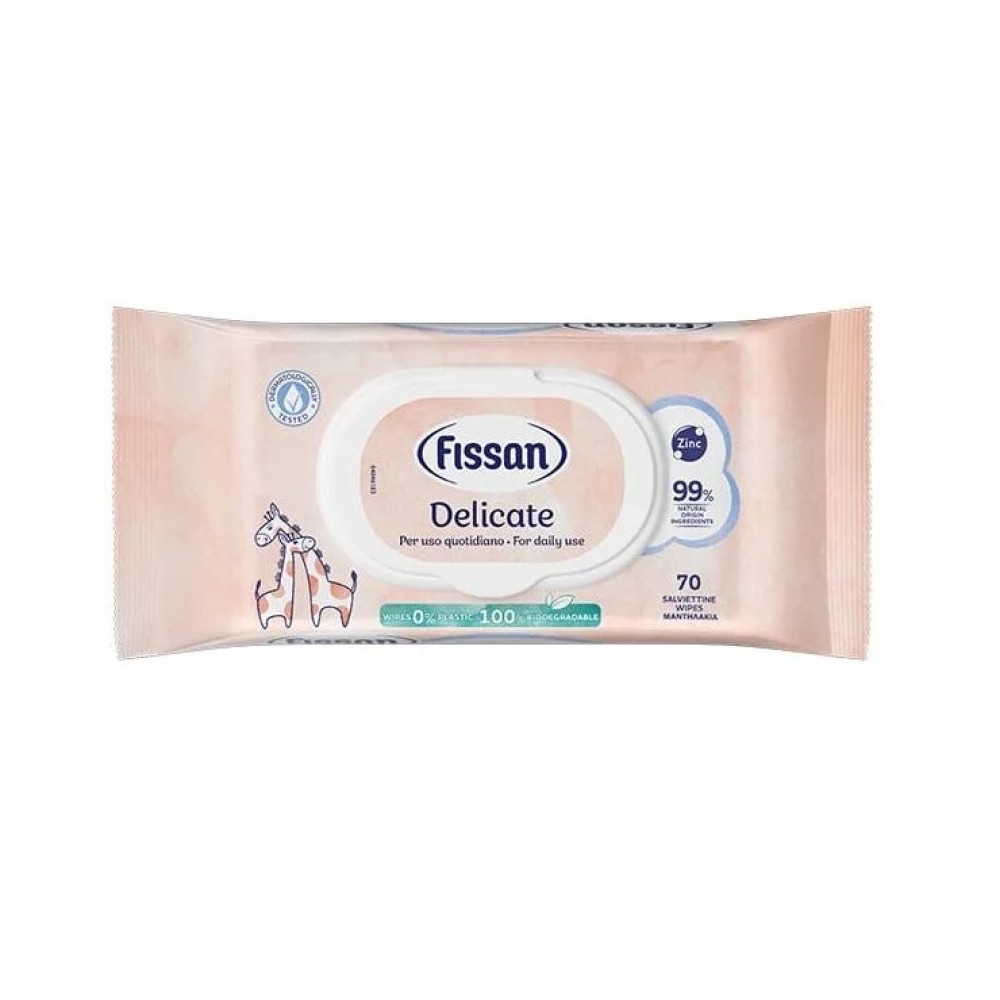 Τα υποαλλεργικά λεπτά μαντηλάκια μαντηλάκια μιας χρήσης Delicate της Fissan είναι κατάλληλα για τον καθαρισμό των οικείων περιοχών των παιδιών, με αντιαρωτική δράση που πρέπει να τα μεταφέρετε ακόμα και όταν ταξιδεύετε.