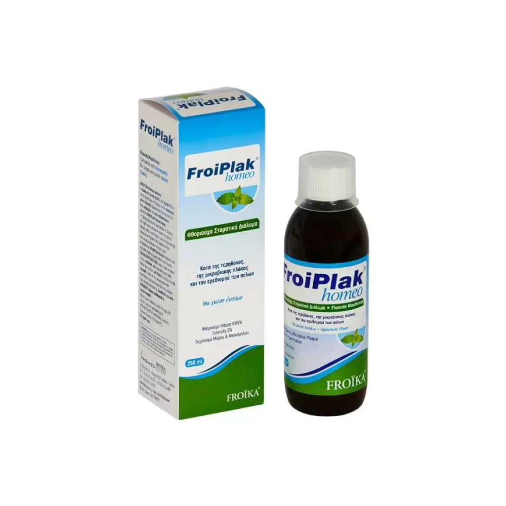 Το Froiplak Homeo Mouthwash προορίζεται για καθημερινή στοματική υγιεινή, για ασθενείς που ακολουθούν ομοιοπαθητική θεραπεία ή εμφανίζουν αλλεργία στη μενθόλη. Κατάλληλη για παιδιά άνω των 7 ετών και για όσους προτιμούν φυσικές γεύσεις Καταπολέμηση της τερηδονογόνου δράσεως των μικροβίων που προκαλούν τερηδόνα Πρόληψη της ουλίτιδας (ερυθρότητα και ερεθισμός των ούλων) Σε περιπτώσεις κακοσμίας του στόματος Οφέλη Ισχυροποίηση της αδαμαντίνης και της οδοντίνης Μείωση της δράσης των βακτηριών που προκαλούν τερηδόνα Καταπολέμηση της οδοντικής πλάκας που είναι η κύρια αιτία των νόσων του περιοδοντίου Διατήρηση την ισορροπία της μικροβιακής χλωρίδας του στόματος Καταπολέμηση του ερεθισμού των ούλων. Καθημερινή στοματική υγιεινή. Αντιμετώπιση της κακοσμίας του στόματος