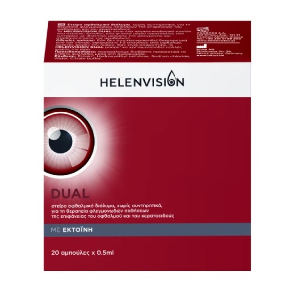 Το HELENVISION DUAL είναι ένα ιατροτεχνολογικό προϊόν που περιέχει Εκτοΐνη, ένα φυσικό μόριο προστασίας των κυττάρων με ιδιότητες μείωσης της φλεγμονής και σταθεροποίησης της μεμβράνης.