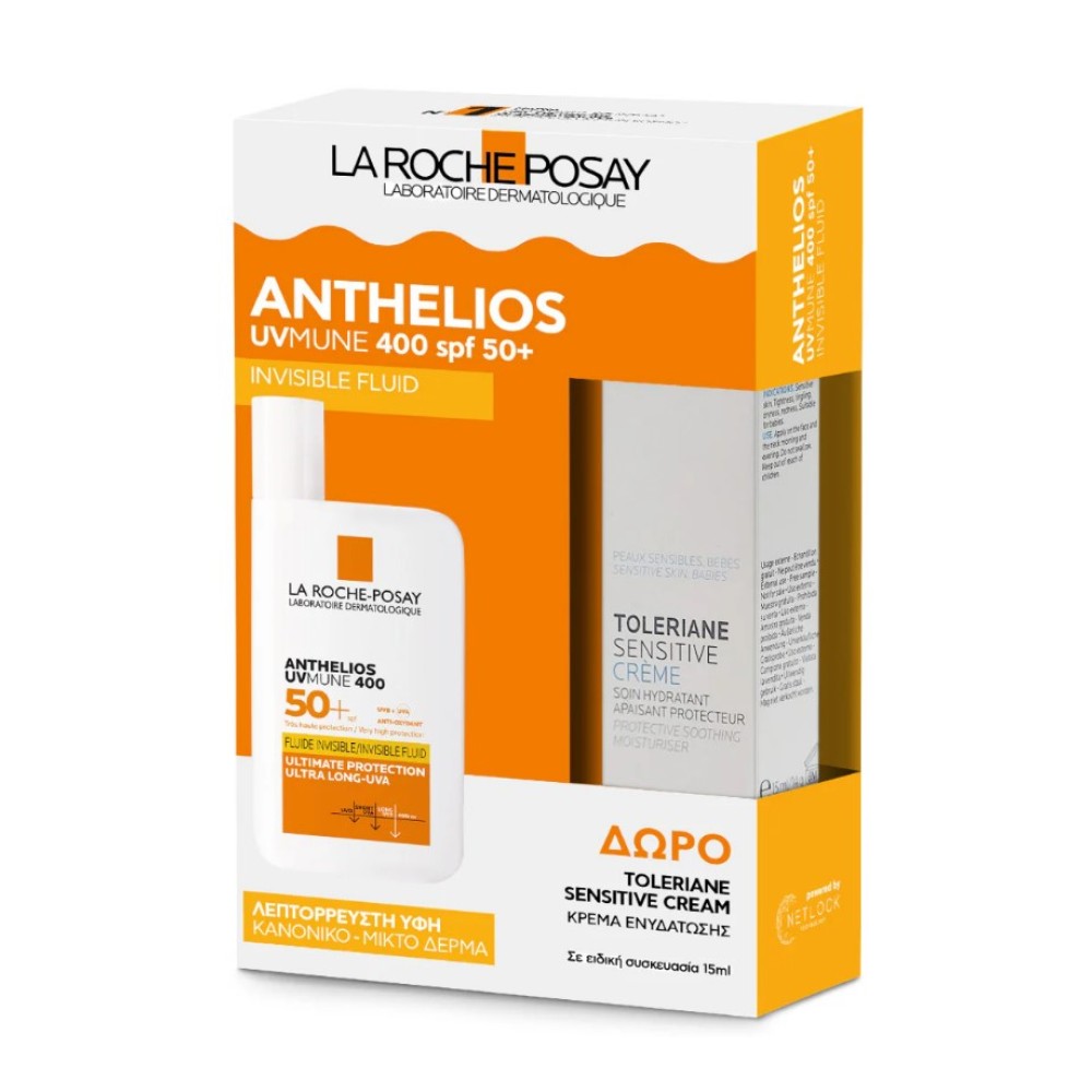 Η Anthelios UV Mune 400 Invisible Fluid SPF50+ παρέχει πολύ υψηλή προστασία ευρέος φάσματος στην μικτή επιδερμίδα και βοηθά στην προστασία από τις βλάβες που προκαλούν η ρύπανση και η υπέρυθρη ακτινοβολία. Η σύνθεσή της περιέχει Mexoryl400, ένα αποκλειστικό UV φίλτρο που προστατεύει ακόμη και από τις πιο επιβλαβείς ακτίνες, μέχρι και 400nm. Η τεχνολογία Netlock παρέχει εξαιρετικά ανθεκτική προστασία, λόγω της ενσωμάτωσης των αντηλιακών φίλτρων σε μικροσωματίδια τζελ μορφής, που δημιουργού ένα ανθεκτικό προστατευτικό φιλμ πάνω στην επιδερμίδα. Επιπλέον, η τεχνολογία XL-Protect παρέχει αποτελεσματική προστασία ενάντια στις βλάβες που προκαλούν η ρύπανση και η υπέρυθρη ακτινοβολία.