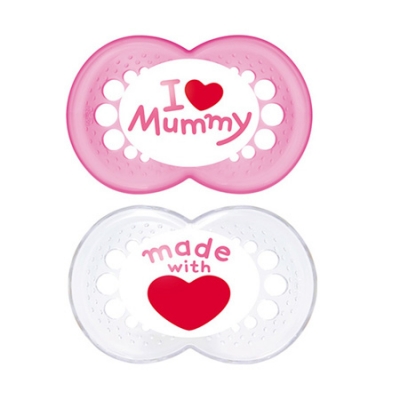 *Τα σχέδια είναι ενδεικτικά και αλλάζουν τακτικά. Παρακαλούμε επιλέξτε σύμφωνα με το φύλο του παιδιού ή υποδείξτε το στη φόρμα παραγγελίας. Εάν υπάρχει ιδιαίτερη προτίμηση στο σχέδιο σημειώστε το επίσης και θα προσπαθήσουμε ανάλογα με τη διαθεσιμότητα να σας εξυπηρετήσουμεMam I Love Mummy Σιλικόνης Ροζ Άσπρη 6m+ 2τμχ