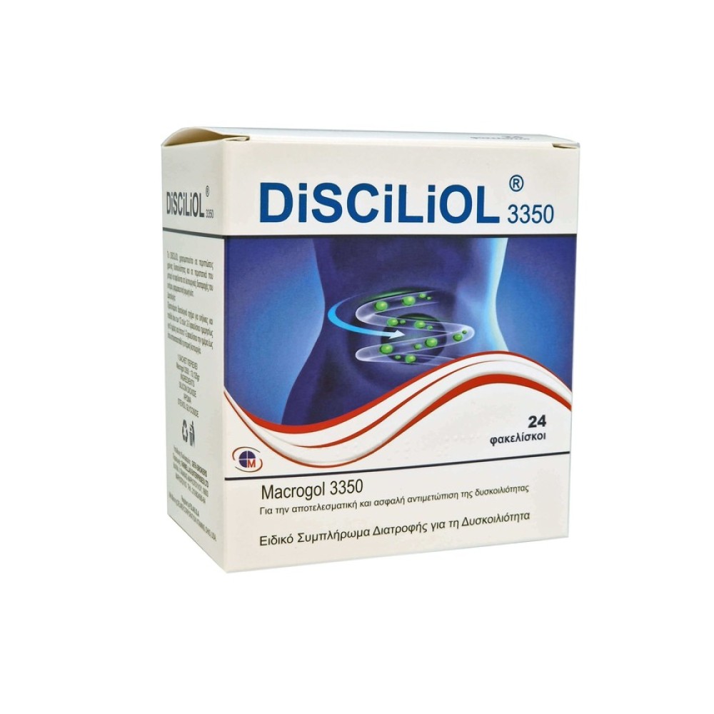 Το DiSCiILiOL 3350 σε σκόνη είναι ένα ήπιο υπακτικό που χρησιμοποιείται σε περιπτώσεις χρόνιας δυσκοιλιότητας και σε περιστατικά που μπορεί να οφείλονται σε λειτουργικές διαταραχές του εντέρου, σε φαρμακευτική αγωγή, κλπ. Έχει υψηλή ικανότητα να αυξάνει τον όγκο και την υγρασία των κοπράνων, μεταφέροντας νερό απευθείας στο έντερο. Εκεί τα σκληρά κόπρανα μαλακώνουν και αυξάνεται ο όγκος τους. Αυτό οδηγεί σε αύξηση της κινητικότητας του εντέρου και διευκολύνει την αποβολή των κοπράνων, χωρίς τους πόνους που συνοδεύουν συνήθως τη δυσκοιλιότητα. Το αποτέλεσμα είναι η επαναφορά της φυσιολογικής κένωσης. Το DISCILIOL 3350 περιέχει μακρογόλη 3350 και δεν έχει παρενέργειες.