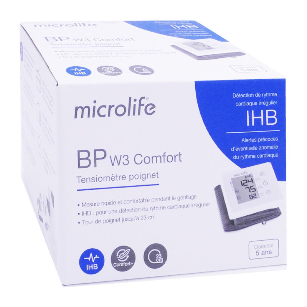 Το πιεσόμετρο καρπού Microlife BP W3 Comfort είναι ένα αυτόματο πιεσόμετρο καρπού με τεχνολογία Comfort+, για εξαιρετικά άνετη μέτρηση πίεσης κατά τη διάρκεια του φουσκώματος της περιχειρίδας. Το BP W3 Comfort αποθηκεύει έως και 30 μετρήσεις πίεσης με ημερομηνία και ώρα και εμφάνιση μέσου όρου. Επιπλέον, η συσκευή διαθέτει τεχνολογία IHB για την ανίχνευση ακανόνιστων καρδιακών παλμών εμφανίζοντας το σύμβολο IHB στην οθόνη. Το πιεσόμετρο διαθέτει πρακτική θήκη αποθήκευσης, ιδανική για μεταφορά κατά τη διάρκεια του ταξιδιού.