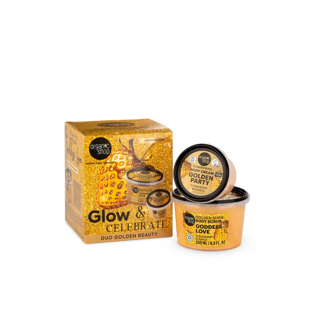 Ανακάλυψε το Organic Shop Basic Glow & Celebrate, ένα εντυπωσιακό σετ δώρου που μεταμορφώνει την περιποίηση σώματος σε ένα glamorous, λαμπερό beauty ritual. Με Golden Shine Body Scrub και Shimmering Body Cream, αυτό το μοναδικό duo προσφέρει άμεση λάμψη, μεταξένια επιδερμίδα και το απολαυστικό άρωμα φρέσκιας οργανικής φράουλας.