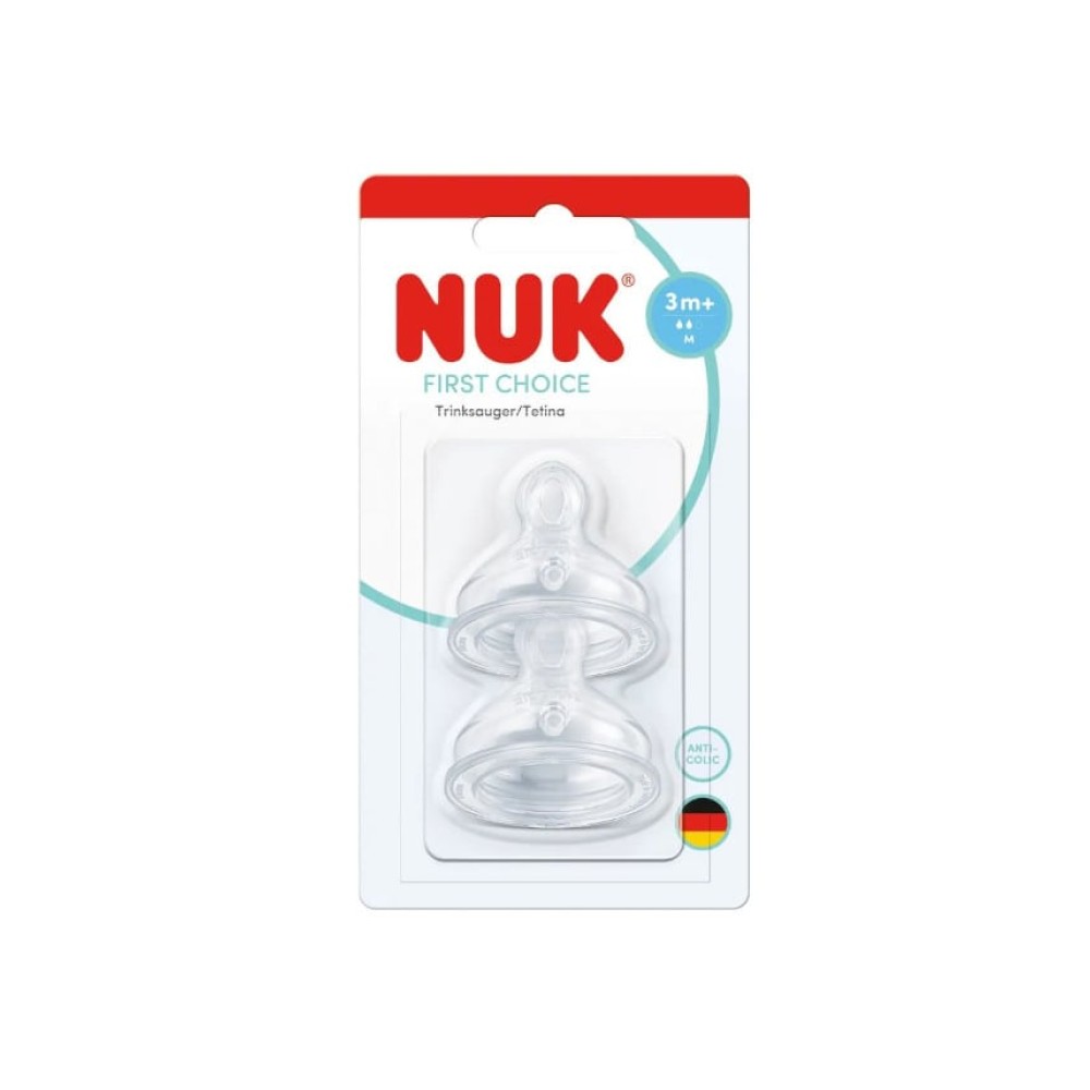 Οι θηλές σιλικόνης NUK First Choice+ (Μεσαία Ροή) σχεδιάστηκαν για ομαλή σίτιση με μπιμπερό και για την υποστήριξη της υγιούς ανάπτυξης του στόματος. Αυτές οι θηλές είναι κατάλληλες για μωρά ηλικίας 3 μηνών και άνω και ταιριάζουν σε όλα τα μπιμπερό NUK First Choice.