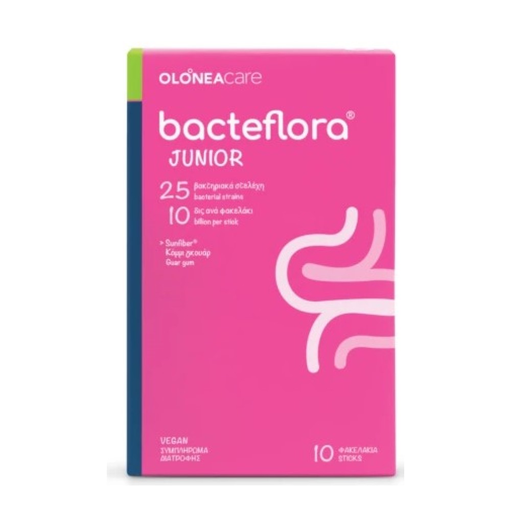 Συσκευασία triple layer foil για αποτελεσματική προστασία των ευαίσθητων προβιοτικών από το οξυγόνο, την υγρασία, τη θερμοκρασία και το ηλιακό φως. Η νέα συσκευασία του OLONEA Bacteflora Junior έχει κατασκευαστεί με τεχνολογία easy cut για εύκολο άνοιγμα.