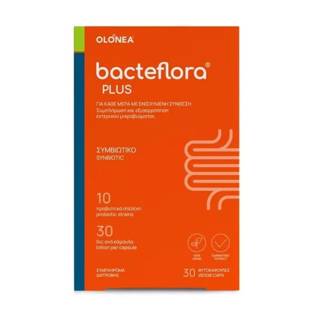 Το bacteflora Plus είναι συμβιωτικό συμπλήρωμα ενισχυμένης σύνθεσης 10 προβιοτικών στελεχών με 30 δις προβιοτικά βακτήρια ανά κάψουλα και πρεβιοτική ινουλίνη για την καθημερινή συμπλήρωση του εντερικού μικροβιώματος και τη φυσιολογική λειτουργία του εντέρου.