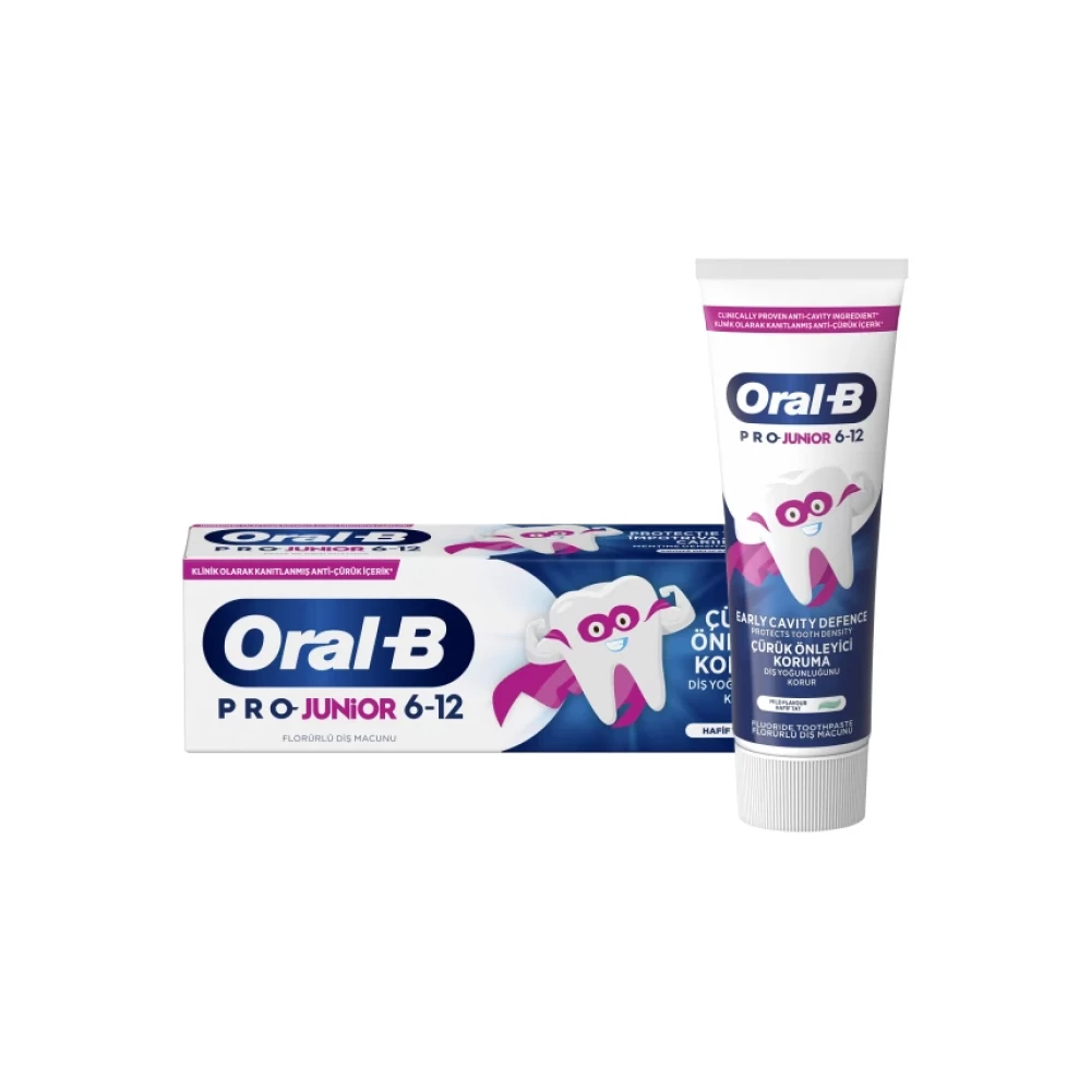 Η οδοντόκρεμα Oral-B Pro Junior έχει σχεδιαστεί ειδικά για παιδιά 6 - 12 ετών. Έχει σχεδιαστεί σε συνεργασία με οδοντιάτρους για να βοηθά στην πρόληψη της τερηδόνας προστατεύοντας τα δόντια από καθημερινά οξέα και σάκχαρα. Περιέχει κατάλληλο για την ηλικία επίπεδο φθορίου για την προστασία της πυκνότητας σμάλτου. Διατίθεται σε απαλή γεύση μέντας.