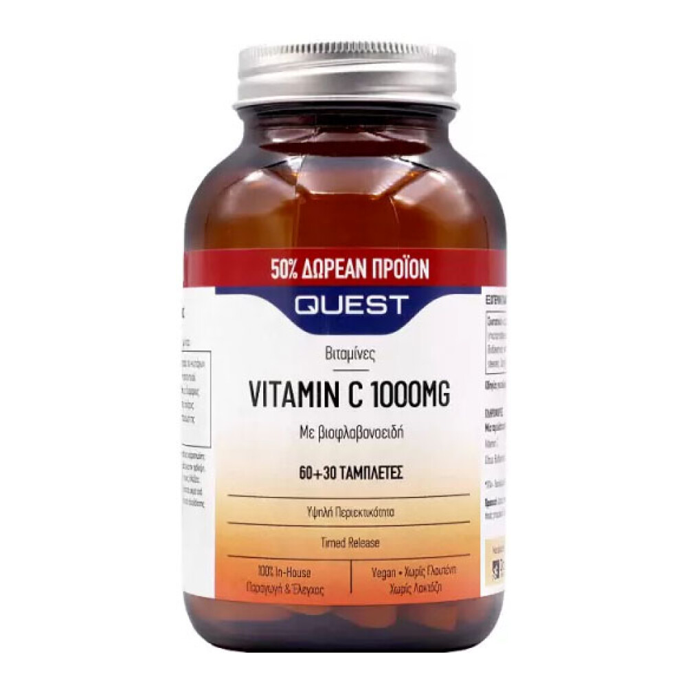 Το συμπλήρωμα διατροφής Vitamin C 1000mg timed release της Quest παρέχει στον οργανισμό βιταμίνη C σε συνδυασμό με βιοφλαβονοειδή. Η βιταμίνη C μπορεί να μειώσει τις πιθανότητες εμφάνισης λοιμώξεων και κρυολογημάτων και είναι απαραίτητη για ένα υγιές ανοσοποιητικό σύστημα.