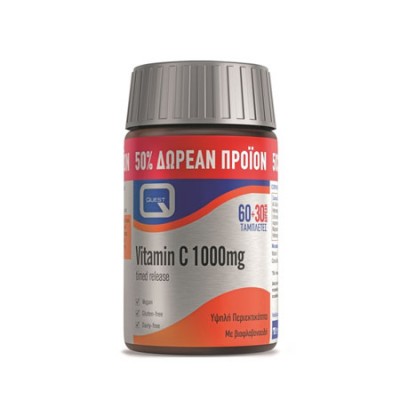 Quest Vitamin C 1000mg Timed Release 90tabs, για προστασία του ανοσοποιητικού Το συμπλήρωμα διατροφής Vitamin C 1000mg timed release της Quest παρέχει στον οργανισμό βιταμίνη C σε συνδυασμό με βιοφλαβονοειδή. Η βιταμίνη C μπορεί να μειώσει τις πιθανότητες εμφάνισης λοιμώξεων και κρυολογημάτων και είναι απαραίτητη για ένα υγιές ανοσοποιητικό σύστημα. Επίσης, προστατεύει τα κύτταρα από οξειδωτικές βλάβες που προκαλούνται από τοξίνες και το περιβάλλον, είναι απαραίτητη για τη σύνθεση του κολλαγόνου κι επομένως ένα σημαντικό δομικό συστατικό για το συνδετικό ιστό του δέρματος (ελαστικότητα), τα αγγεία του δέρματος, τους τένοντες, τους συνδέσμους και τα οστά. Επιπλέον, ενισχύει τη δραστηριότητα των αντι-στρες ορμονών, υποστηρίζει την καλή καρδιαγγειακή υγεία, διατηρεί τη χοληστερόλη σε καλά επίπεδα και αυξάνει την απορρόφηση του σιδήρου. Δοσολογία & Οδηγίες Χρήσης Μια έως τρεις ταμπλέτες την ημέρα με το γεύμα. Λήψη βιταμίνης C περισσότερης από 1000mg μπορεί να προκαλέσει ήπια στομαχική διαταραχή σε ανθρώπους με ευαισθησία.