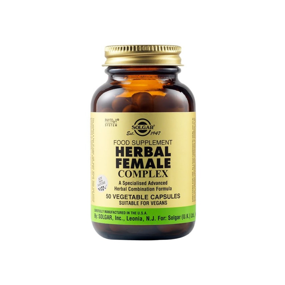 Συνεργιακός συνδυασμός από τιτλοδοτημένα εκχυλίσματα βοτάνων και ολόκληρα βότανα, χρήσιμος στα συμπτώματα της προεμμηνορυσίας και της εμμηνόπαυσης όπως κράμπες, καθυστερημένη εμμηνορυσία, εξάψεις. Αποτελεί γενικό βοήθημα για το γυναικείο αναπαραγωγικό σύστημα.Σε φυτοκάψουλες. Κατάλληλο για vegans.HERBAL FEMALE COMPLEX veg.caps 50s Ανά 1 φυτοκάψουλα παρέχει: Εκχύλισμα ρίζας Black Cohosh (4::1) σε σκόνη 100mg Βλαστός σόγιας (2mg [2%] ισοφλαβόνες) σε σκόνη 100mg Εκχύλισμα Motherwort Aerial (5:1) σε σκόνη 75mg Τιτλοδοτημένο εκχύλισμα Agnus Castus (0.38mg [0,5%] αγκνουσίδες) σε σκόνη 75mg Εκχύλισμα ρίζας Dong Quai (0,75mg [1%] lingustilide) σε σκόνη 75mg Ακατέργαστη ρίζα Astragalus σε σκόνη 75mg Τιτλοδοτημένο εκχύλισμα Milk Thistle (ολικά φλαβονοειδή συμπεριλαμβανομένης της συλιμαρίνης 40mg [80%]) σε σκόνη 50mg Ακατέργαστη ρίζα Dong Quai σε σκόνη 50mgΔοσολογία: Λαμβάνετε 1-3 φυτοκάψουλες ημερησίως κατά προτίμηση με τα γεύματα50 φυτοκάψουλες
