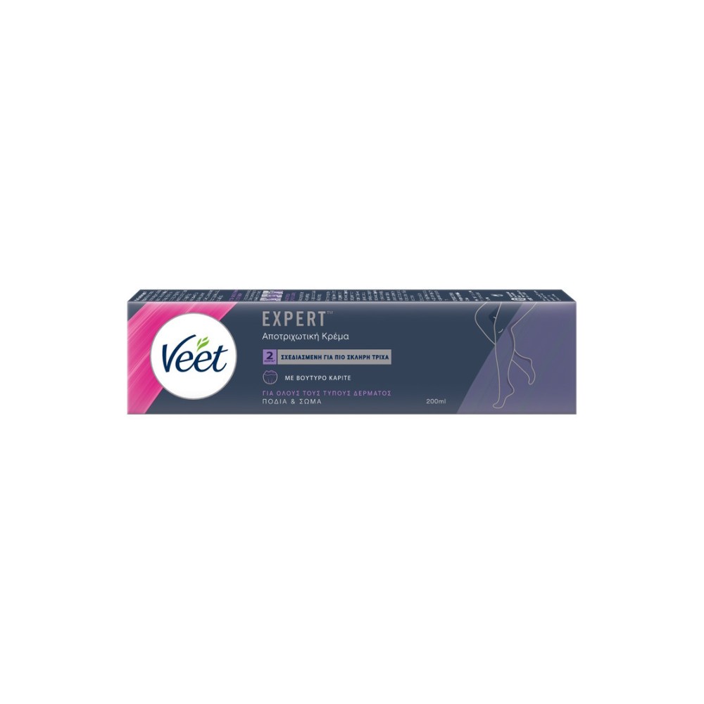 Η Veet Expert αποτριχωτική κρέμα με βούτυρο καριτέ και εμπλουτισμένη με έναν ενυδατικό παράγοντα που βρίσκεται φυσικά στο δέρμα. Σχεδιασμένη για αφαίρεση πιο σκληρής τρίχας, είναι αποτελεσματική από 2 λεπτά και διατηρεί το δέρμα ενυδατωμένο για 48 ώρες. Δερματολογικά ελεγμένο κατάλληλο για όλους τους τύπους δέρματος, συμπεριλαμβανομένων των ευαίσθητων.