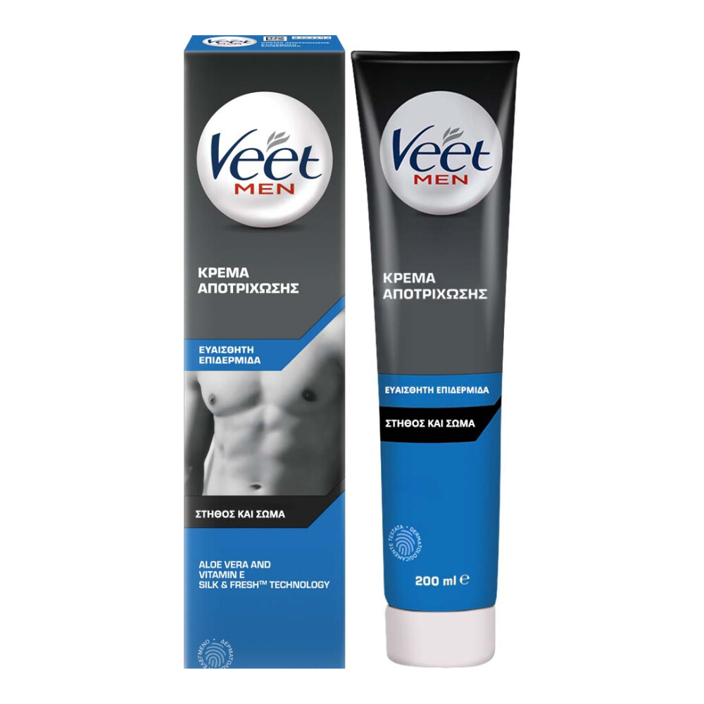 H Veet for Men Κρέμα Αποτρίχωσης για ευαίσθητες επιδερμίδες για Άνδρες είναι ιδανική για την αποτρίχωση του στήθους και του σώματος των ανδρών. Απολαύστε μια λεία επιδερμίδα με τη κρέμα αποτρίχωσης Veet Men, τώρα με τεχνολογία Silk & Fresh™ που αφαιρεί γρήγορα και αποτελεσματικά τις τρίχες, αφήνοντας την επιδερμίδα σας λεία. Η νέα Veet όχι μόνο ενυδατώνει την επιδερμίδα σας για έως και 24 ώρες, αλλά η νέα τεχνολογία αρώματος είναι σχεδιασμένη για να εξασφαλίσει ότι δεν παραμένει δυσάρεστη οσμή.Η φόρμουλά της είναι σχεδιασμένη για να λειτουργήσει κοντά στη ρίζα και να αφαιρέσει ακόμα και πολύ κοντές τρίχες.Κατάλληλη για κανονικές και ευαίσθητες επιδερμίδες.