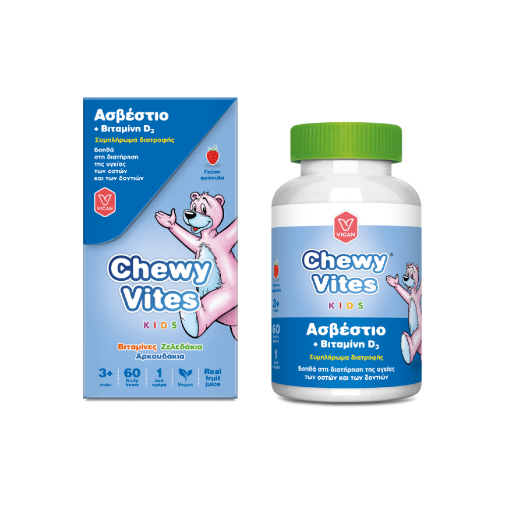 Οι Chewy Vites με Ασβέστιο + D 3 είναι ένα ισορροπημμένο πολυβιταμινούχο που συμβάλλει στη διατήρηση της υγείας των οστών και των δοντιών.Με φυσική πηκτίνη φρούτων και υπεροχή γεύση.Ένα CHEWY VITES αρκουδάκι με Ασβέστιο + D 3 περιέχει 125mg Ασβεστίου και 5mg βιταμίνης D 3.Κατάλληλες για παιδιά από ενός έτους και άνω.Η σειρά Chewy® Vites κυκλοφορεί σε: