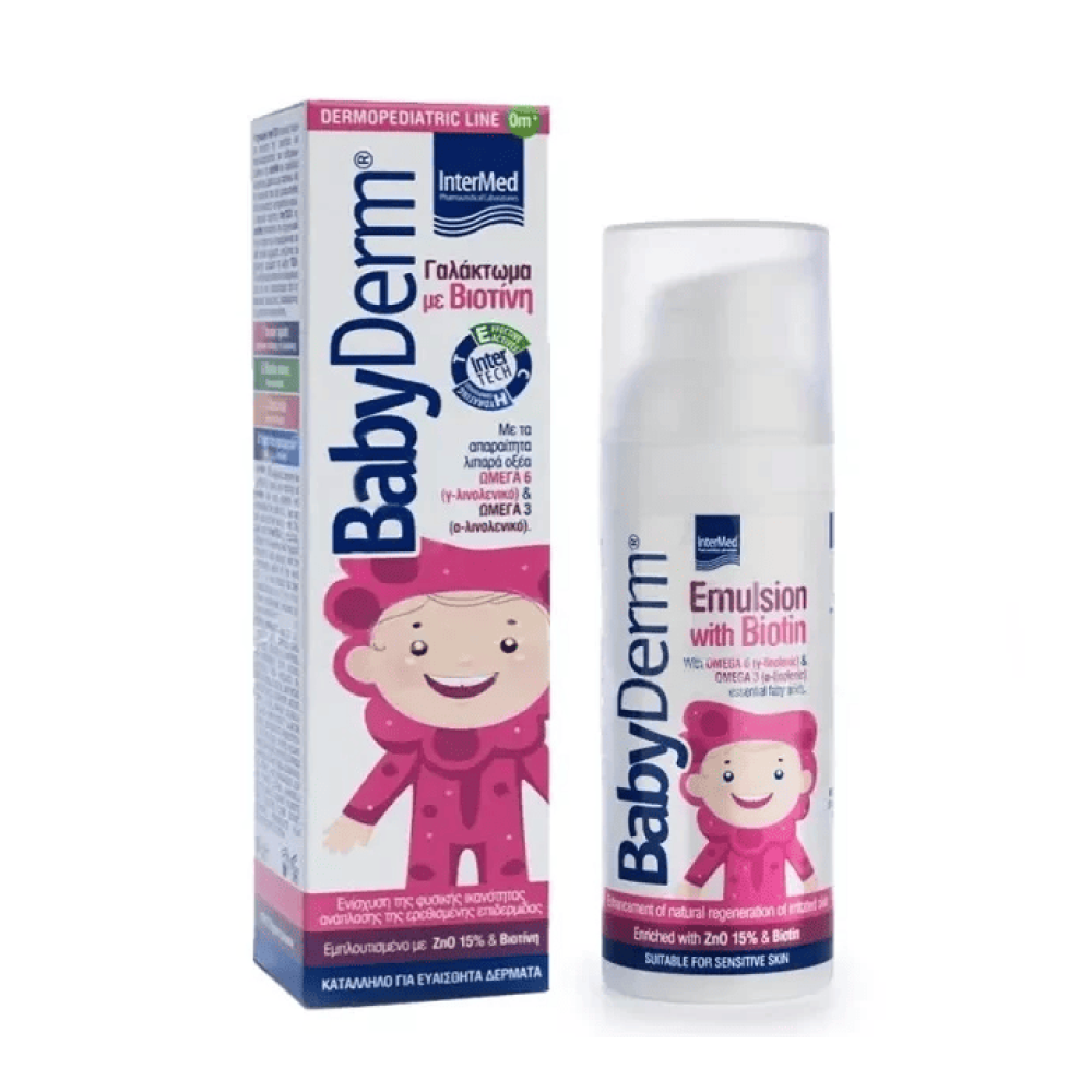 Το Babyderm Emulsion είναι ειδικά σχεδιασμένο κρεμογαλάκτωμα με βιοτίνη, για την ανάπλαση και προστασία της ευαίσθητης βρεφικής και παιδικής μηρογεννητικής περιοχής (περιοχή της πάνας) από ερεθισμούς & φλεγμονές.