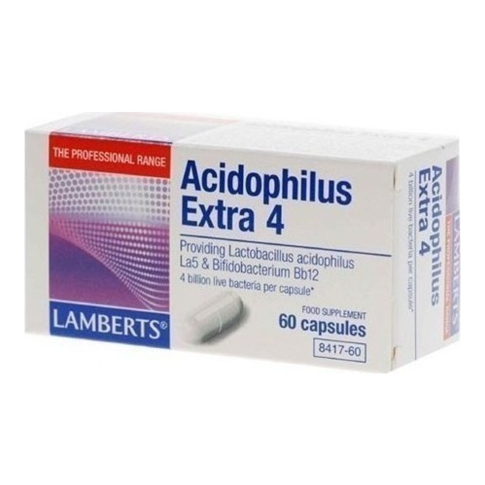 Το γαστρεντερικό μας σύστημα εμπεριέχει δισεκατομμύρια από βακτήρια τα περισσότερα εκ των οποίων είναι αβλαβή. Για την διατήρηση της υγείας του γαστρεντερικού συστήματος απαιτείται ισορροπία μεταξύ των παθογόνων βακτηρίων και των φιλικών βακτηρίων της εντερικής χλωρίδας. Το Acidophilus Extra 4 της Lamberts, αποτελεί ένα σκεύασμα χωρίς προσθήκη γάλακτος, που περιέχει 4 δισεκατομμύρια φιλικά βακτήρια ανά κάψουλα (κατά τη στιγμή της παρασκευής). Παρά το γεγονός ότι το Acidophilus είναι σταθερό σε θερμοκρασία δωματίου, για την διασφάλιση της μέγιστης δραστικότητας, συνίσταται η αποθήκευσή του στο ψυγείο. Η ειδική συσκευασία του Acidophilus προστατεύει από την συνθήκες υγρασίας, οι οποίες είναι γνωστό ότι συμβάλλουν στην αλλοίωση της βιωσιμότητας των βακτηριδίων. Τα βακτηρίδια που περιέχονται στο Acidophilus Extra 4 είναι περιέχονται στο Acidophilus Extra 4 είναι αποξηραμένα σε υψηλές θερμοκρασίες και περιβάλλονται από ένα οξεάντοχο κάλυμμα πολυσακχαρίτη, προστατεύοντας τα από το όξινο ph του στομάχου.