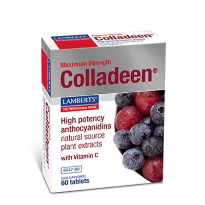 Είναι 20 φορές πιο ισχυρό αντιοξειδωτικό από τη βιταμίνη Ε και βοηθάει στο κολλαγόνο του δέρματος. Όταν θέλουμε θεραπευτική δράση συνιστάται η λήψη 2 ταμπλετών ημερησίως, ενώ όταν θέλουμε να διατηρήσουμε το επιθυμητό αποτέλεσμα, τότε συνιστάται η χρήση μίας ταμπλέτας ημερησίως. Γενικά το Colladeen μπορεί να χορηγηθεί στις ακόλουθες περιπτώσεις: Για τραυματισμούς κατά την άθληση ή για σύνδρομο χρόνιας κόπωσης, για αυξημένο κίνδυνο καρδιοπάθειας, για περιπτώσεις εκφύλισης με την εμφάνιση κηλίδων στο δέρμα ή προ των οφθαλμών, για ευαισθησία των μαστών κατά τη διάρκεια της εμμήνου ρύσης, για την ενίσχυση της αγγειακής λειτουργίας, για την ενίσχυση και διατήρηση του κολλαγόνου, για εμφάνιση υψηλής πίεσης στα μάτια, για ενδομητρίωση ή για δυσμηνόρροια, ως πηγή αντιοξειδωτικών ουσιών, για διάφορες αλλεργίες, καθώς και για φλεγμονή του κοιλώματος, για τις αντιρυτιδικές του ιδιότητες. Το προϊόν αυτό αποτελεί μία από τις πιο πλούσιες πηγές ανθοκυανιδίνων στην αγορά, παρέχοντας 160mg ανθοκυανιδίνων (από εκχύλισμα σπόρων σταφυλιού και μύρτιλλων) ανά ταμπλέτα.Ταμπλετοποίηση με:DiCalcium Phosphate, Cellulose, Tablet Coating (Colours: Titanium Dioxide & Iron Oxides, Hydroxypropyl Methylcellulose, Glycerin), Crosslinked Cellulose Gum,Stearic Acid, Silicon Dioxide, Magnesium Stearate.Χρόνος αφομοίωσης: Λιγότερο από 1 ώρα.Κατάλληλο για χορτοφάγους.Αλλεργίες: Καμία.Προφυλάξεις:Δεν πρέπει να λαμβάνεται από έγκυες ή θηλάζουσες γυναίκες.Παρενέργειες, υπερδοσολογία:Καμία γνωστή για την προτεινόμενη δόση.Φύλαξη:Να φυλάσσεται σε δροσερό και ξηρό περιβάλλον και να προφυλάσσεται απτό φως.