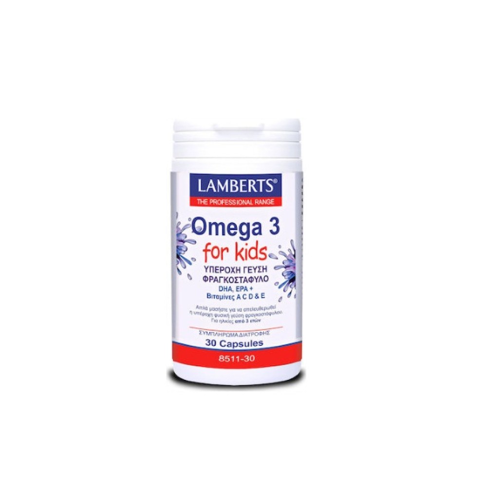 Με γεύση βατόμουρο-(DHA, EPA και Βιταμίνες A,C,D, και Ε).Το προϊόν της Lamberts Omega 3 Berry Bursts, έχει σχεδιαστεί ειδικά για παιδιά 3 ετών και άνω. Μασώντας την μαλακή κάψουλα απελευθερώνεται μία έκρηξη φυσικής γεύσης φραγκοστάφυλου παρέχοντας συγχρόνως απαραίτητα ωμέγα 3 λιπαρά οξέα σε συνδυασμό με βιταμίνες A, C, D και E.Το προϊόν αυτό αποτελεί μία ιδιαίτερα πλούσια πηγή του ωμέγα 3 λιπαρού οξέος ,DHA, το οποίο εκτιμάται ότι είναι απαραίτητο για τη σωστή λειτουργία του εγκεφάλου. Οι βιταμίνες A,C,D και Ε βοηθούν στην διατήρηση ενός υγιούς ανοσοποιητικού συστήματος, όπως επίσης και της υγείας του δέρματος, των δοντιών, των οστών και των οφθαλμών.