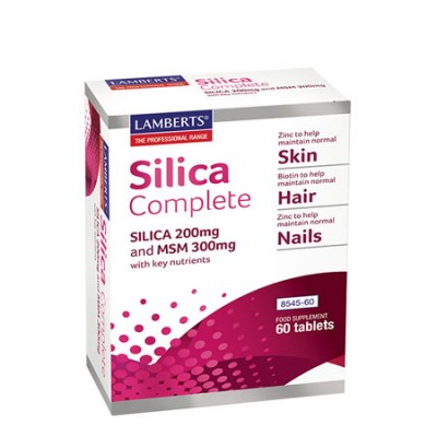Το Silica Complete αποτελεί μια ειδικά σχεδιασμένη φόρμουλα από το Επιστημονικό Τμήμα της Lamberts για την υγεία του δέρματος των νυχιών και των μαλλιών, καθώς περιέχει όλα εκείνα τα μικροθρεπτικά συστατικά τα οποία αποδεδειγμένα  συμβάλλουν στην υγεία του δέρματος και των δομών του.Ψευδάργυρο : συμβάλλει στην διατήρηση της υγείας των μαλλιών και των νυχιώνΒιοτίνη : συμβάλλει στην διατήρηση της υγείας τoυ δέρματοςΒιταμίνη C : συμβάλλει στην φυσιολογική σύνθεση του κολλαγόνου. Το κολλαγόνο αποτελεί την κυριότερη και σημαντικότερη πρωτεΐνη του ανθρωπίνου δέρματος και συγχρόνως την σημαντικότερη πρωτεΐνη του ανθρωπίνου οργανισμού. Συγκεκριμένα, αποτελεί την πρωτεΐνη εκείνη η οποία σχηματίζει τον συνδετικό ιστό σε ιστούς όπως το δέρμα, τα μαλλιά, τα νύχια, τους συνδέσμους, τον αρθρικό χόνδρο, τους μυς και τα τριχοειδή αγγεία. Κάθε τριχικός θύλακος του τριχωτού της κεφαλής, περιβάλλεται από ένα περίβλημα κολλαγόνου με τριχοειδή αγγεία, μέσω των οποίων τα απαραίτητα μικροθρεπτικά συστατικά συμβάλουν στην θρέψη και ανάπτυξη της τρίχας.MSM : (Μέθυλοσουλφομεθάνη), ένα συστατικό φυσικής προελεύσεως που περιέχει θείο, καθώς αυτό αποτελεί ένα ζωτικής σημασίας μικροθρεπτικό συστατικό για την παραγωγή πρωτεϊνών του συνδετικού ιστού και την παραγωγή κερατίνης των νυχιών και των μαλλιών.Τέλος, περιέχει υψηλή ποσότητα πυριτίου, το οποίο αποτελεί ένα από τα  κύρια ιχνοστοιχεία για την δομή και ακεραιότητα του συνδετικού ιστού. Πιο συγκεκριμένα, ενεργοποιώντας  τους ινοβλάστες του δέρματος αυξάνει την σύνθεση του κολλαγόνου και της ελαστίνης, βελτιώνοντας την ανθεκτικότητα και ελαστικότητα του συνδετικού ιστού. Το πυρίτιο της Lamberts, είναι φυσικής προελεύσεως καθώς προέρχεται από φυτικό πυρίτιο (Bamboo gum).Το φυτικό πυρίτιο, αποτελεί την πιο πλούσια(παρέχει 75% οργανικό πυρίτιο) και βιοδιαθέσιμη μορφή πυριτίου στον κόσμο και την μορφή με την οποία έχει διεξαχθεί η πλειοψηφία των δημοσιευμένων κλινικών μελετών.