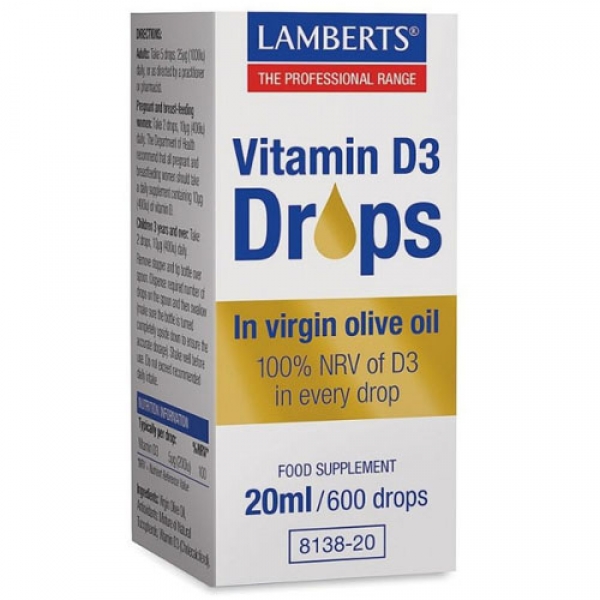 Lamberts Vitamin D3 Drops Συμπλήρωμα διατροφής σε παρθένο ελαιόλαδο Κάθε σταγόνα περιέχει 5μg (200iu) βιταμίνης D3. Η βιταμίνη D3 συμβάλλει: στη φυσιολογική λειτουργία του ανοσοποιητικού συστήματος στη φυσιολογική απορρόφηση και χρησιμοποίηση του ασβεστίου και του φωσφόρου στη διατήρηση των φυσιολογικών επιπέδων ασβεστίου στο αίμα στη διατήρηση της φυσιολογικής κατάστασης των οστών στη φυσιολογική κατάσταση των μυών στη διατήρηση της φυσιολογικής κατάστασης των δοντιών στην κυτταρική διαίρεση Ιδανικό για όλη την Οικογένεια. Κατάλληλο για Χορτοφάγους. Οδηγίες Χρήσης: 1-5 σταγόνες ημερησίως μετά το γεύμα. Ο αριθμός των προσλαμβανόμενων σταγόνων μπορεί να τροποποιηθεί κατόπιν συστάσεων του Ιατρού σας. Συσκευασία: 20ml / 600 σταγόνες