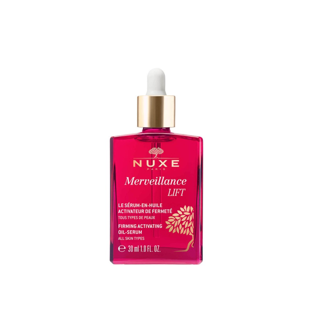 Αντιγηραντικό serum σύσφιξης Merveillance Lift με υφή ελαίου της Nuxe. Με εξαιρετικά επανορθωτικό έλαιο από μικροφύκη, ενδυναμώνει τη δομή της επιδερμίδας και ενισχύει την παραγωγή κολλαγόνου IV μειώνοντας το βάθος και τον αριθμό των ρυτίδων.