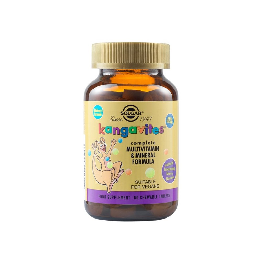 Η πολυβιταμίνη Kangavites Complete Multi vitamin & Mineral Formula της Solgar είναι μία προηγμένη πολυφόρμουλα σχεδιασμένη για να καλύπτει τις εξειδικευμένες ανάγκες των παιδιών από 3 ετών και πάνω. Με 28 ενεργά συστατικά που περιλαμβάνουν θρεπτικά στοιχεία, όπως ασβέστιο, μαγνήσιο, σίδηρο, ιώδιο και βιταμίνες C, D και B, το προϊόν πολυβιταμινών και μεταλλικών στοιχείων Kangavites, σε συνδυασμό με υγιεινή και ισορροπημένη διατροφή, είναι εξαιρετικός τρόπος ενίσχυσης της ανάπτυξης και εξέλιξης των παιδιών.