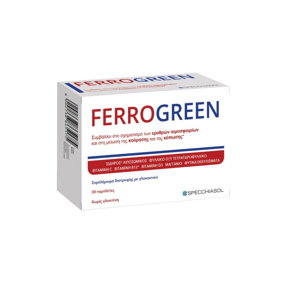 Το Ferrogreen Plus σε ταμπλέτες είναι ένα συμπλήρωμα διατροφής με Σίδηρο, Μαγγάνιο, Βιταμίνη C, συμπυκνωμένο χυμό φρούτων και λαχανικών και φυτικά εκχυλίσματα. Ο Σίδηρος συμβάλλει στο φυσιολογικό σχηματισμό των ερυθρών αιμοσφαιρίων και της αιμοσφαιρίνης ενώ παράλληλα βοηθάει στη μείωση της κούρασης και της κόπωσης. Η βιταμίνη C αυξάνει την απορρόφηση του σιδήρου. Το Μαγγάνιο και η βιταμίνη Β12 μαζί με Σίδηρο και βιταμίνη C συμβάλλουν στην παραγωγή της ενέργειας. Η βιταμίνη Β12 προάγει το φυσιολογικό σχηματισμό των ερυθρών αιμοσφαιρίων.