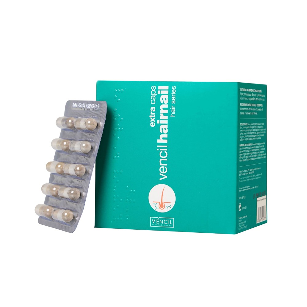 Vencil Hairnail 90caps (Αγωγή 3 Μηνών για Μαλλιά - Νύχια - Δέρμα)   Αν έχετε παρατηρήσει τα μαλλιά σας να χάνουν τον όγκο τους, το δέρμα σας να δείχνει θαμπό και τα νύχια σας να σπάνε, τότε ο οργανισμός σας χρειάζεται ενίσχυση από ένα δυνατό συμπλήρωμα διατροφής.   Το Vencil Hairnail Caps συμβάλλει στην ενδυνάμωση της τρίχας, καθώς και στον σχηματισμό για υγιή και δυνατά νύχια που δεν σπάνε, χάρη στα συστατικά,  τις βιταμίνες, τα αμινοξέα και τα ιχνοστοιχεία που περιέχει.   Περιέχει: ΒΙΤΑΜΙΝΕΣ Βιταμίνη C Βιταμίνη Β2 Βιταμίνη B12 Βιταμίνη Β1 Βιταμίνη A Bιταμίνη B5 Βιοτίνη Βιταμίνη Β9 Bιταμίνη E ΙΧΝΟΣΤΟΙΧΕΙΑ   Ψευδάργυρος Σίδηρος ΑΜΙΝΟΞΕΑ L-Μεθειονίνη L-Κυστεΐνη L-ΚυστίνηΗ μοναδική του σύνθεση: Συμβάλλει στην ενδυνάμωση της τρίχας Συμβάλλει στον σχηματισμό δυνατών και υγιών νυχιών Βοηθά στην υγεία της επιδερμίδας Παρέχει αντιοξειδωτική προστασία Συνιστώμενη δόση για ημερήσια κατανάλωση:   Ενήλικες και παιδιά άνω των 16 ετών, μία κάψουλα ημερησίως μαζί με το πρωινό   Χωρίς: ζάχαρη, αλάτι, γλουτένη, άμυλο, γαλακτοκομικά, τεχνητά χρώματα και συντηρητικά