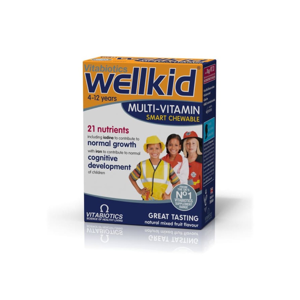 Το Wellkid της Vitabiotics αποτελεί μια μοναδική σύνθεση 21 απαραίτητων συστατικών σε μορφή μασώμενης ταμπλέτας, που έχει σχεδιαστεί ειδικά για παιδιά στην ανάπτυξη, ηλικίας 4-12 ετών. Κάθε ταμπλέτα παρέχει βιταμίνες και μέταλλα σε περιεκτικότητες κατάλληλες για παιδιά, καθώς και ωμέγα-3 λιπαρά οξέα φυτικής προέλευσης (από λιναρόσπορο).